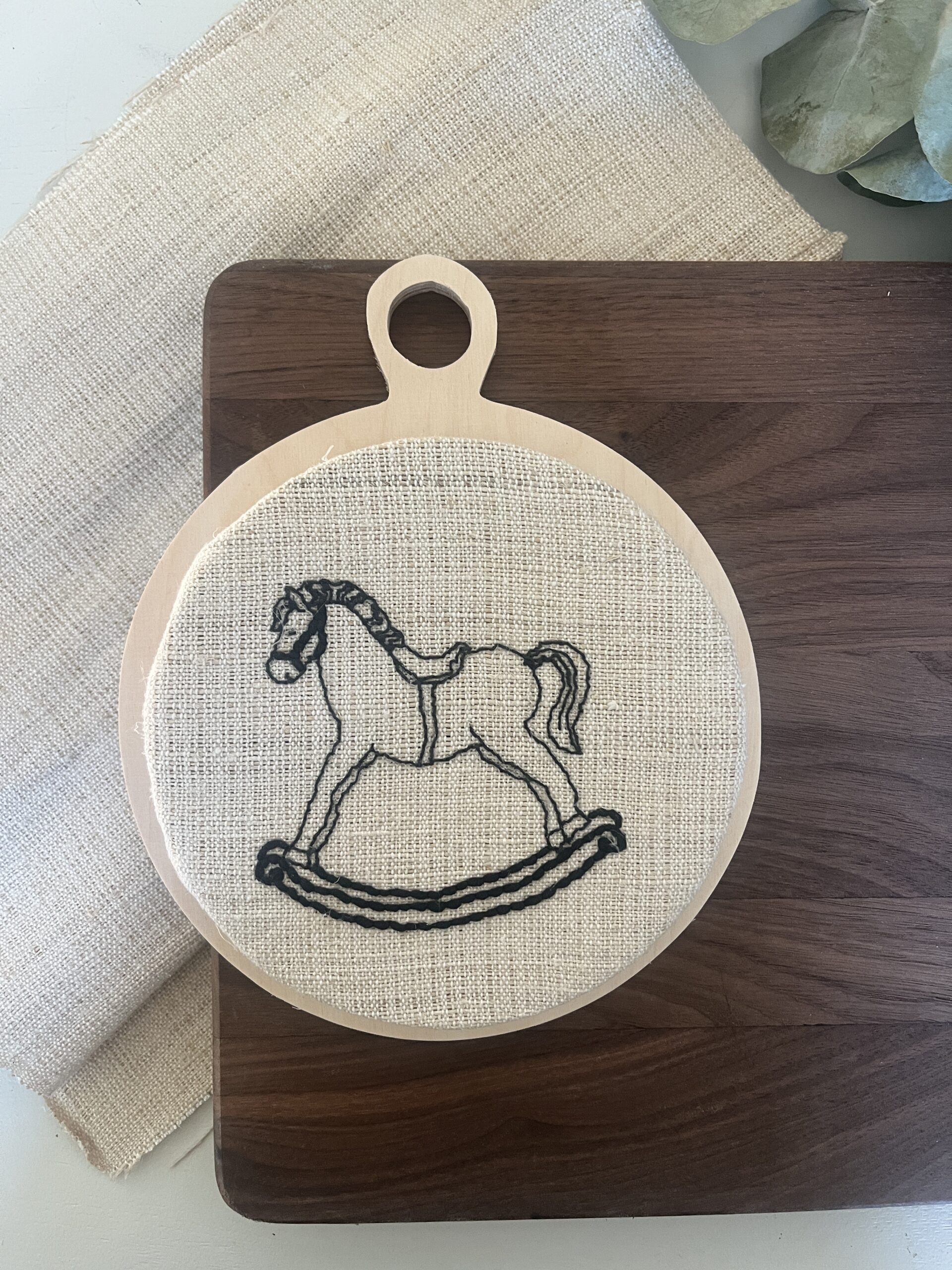 Geborduurde wand bordjes op antiek linnen (dia 15cm).