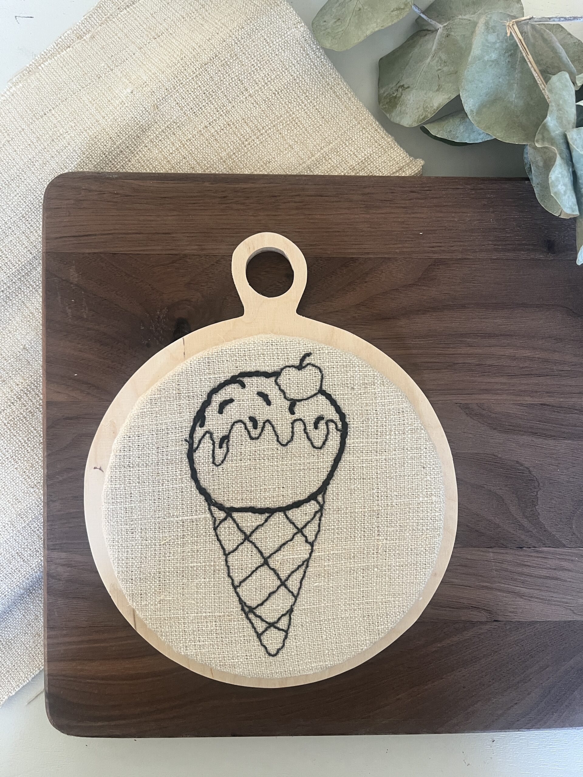 Geborduurde wand bordjes op antiek linnen (dia 15cm).