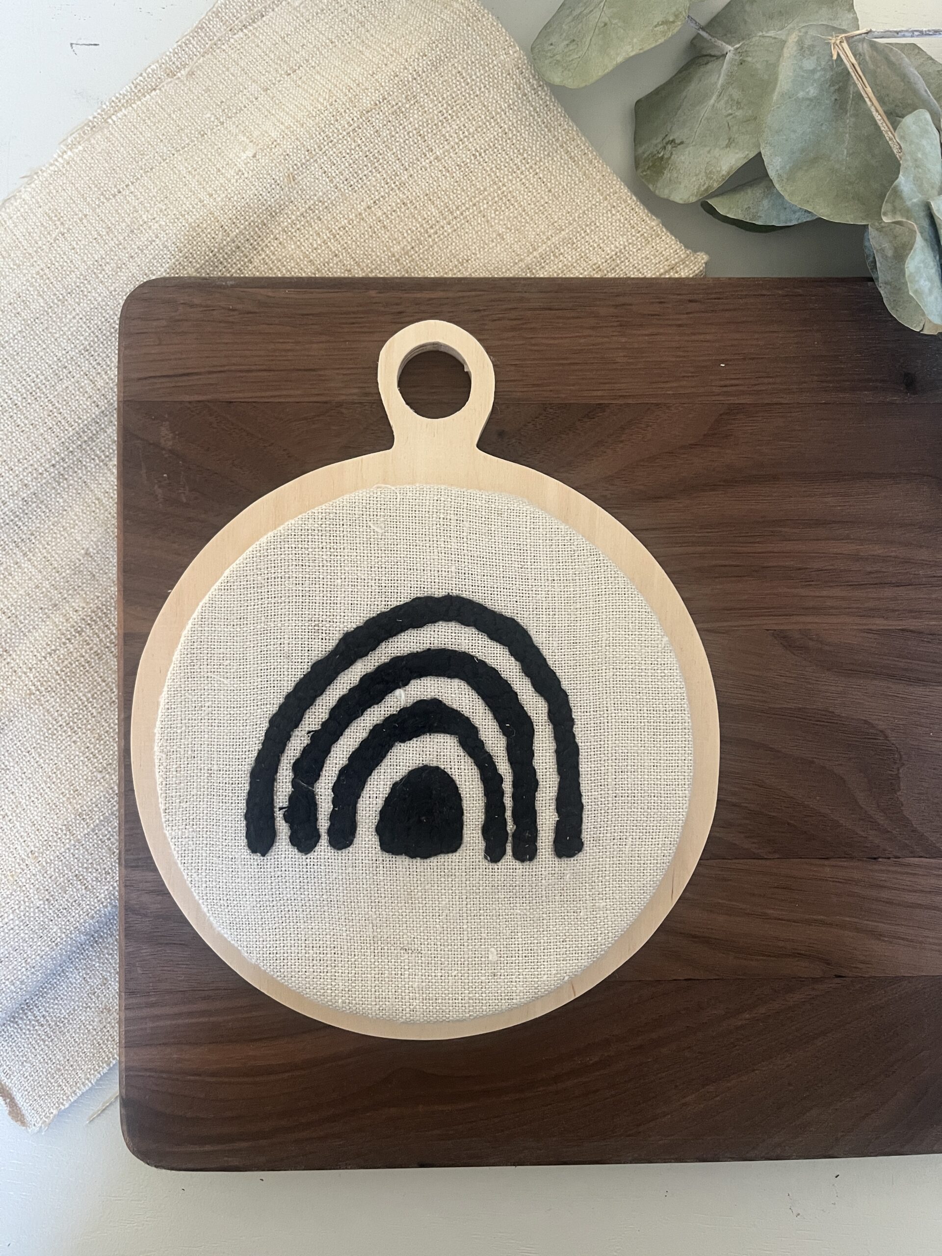 Geborduurde wand bordjes op antiek linnen (dia 15cm).