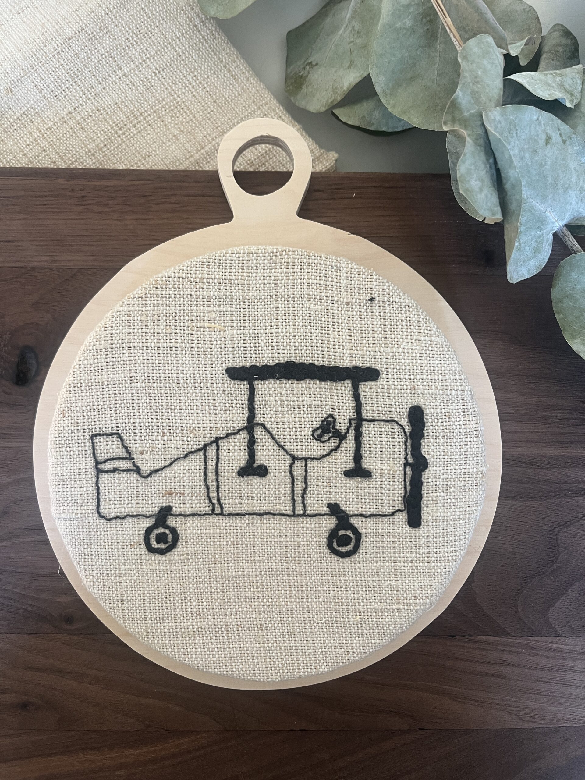 Geborduurde wand bordjes op antiek linnen (dia 15cm).